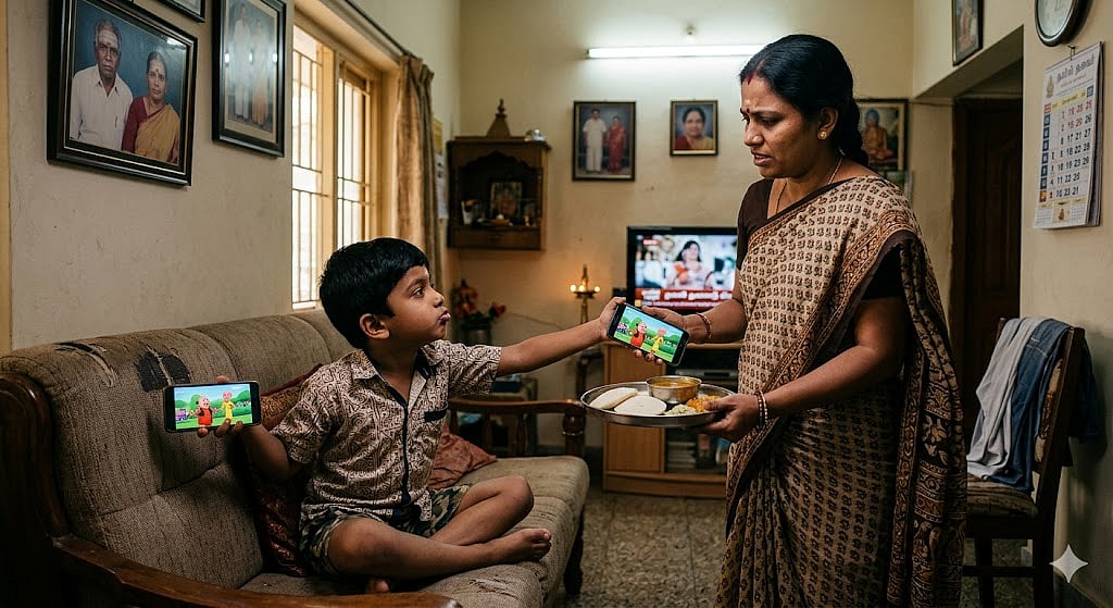 மதுரையைச் சேர்ந்த 12 வயது ராகவ், காலை 7 மணிக்கு எழுந்து உடனடியாக தனது டேப்லெட் மற்றும் தொலைபேசியை தேடினான். "அம்மா, எனக்கு இப்போதே கேம் விளையாட வேண்டும்!" என்று அழுதான்.